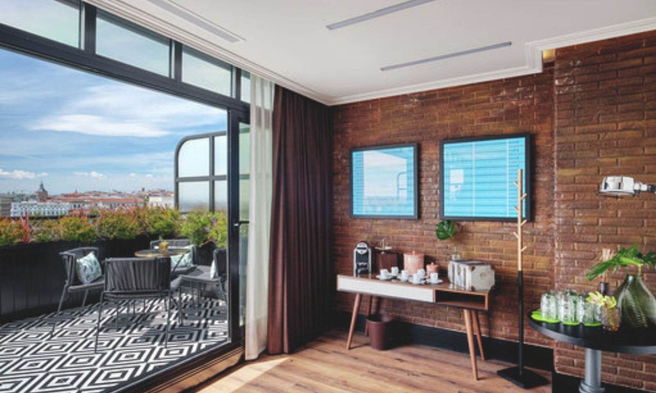 Helles Zimmer mit Stadtblick und Balkon sowie einem außergewöhnlichen Dekor, das industrielle Glamour-Elemente wie freiliegende Ziegel mit warmen Holzakzenten kombiniert.