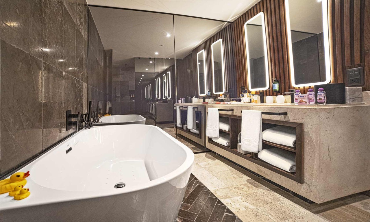 Den exklusivsten Aufenthalt erlebst du diesem Zimmer, das sich über zwei Etagen erstreckt und dir eine spektakuläre Terrasse mit Essbereich und privatem Pool bietet.