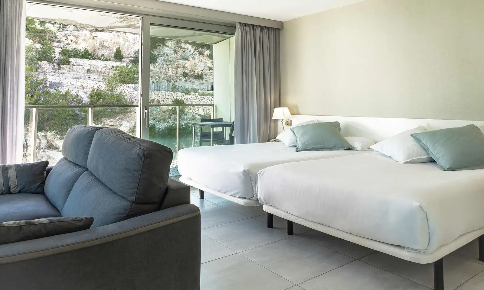 With 30 m² of space, Superior rooms offer more space and comfort. This room features a flat-screen TV, safe, and minibar (extra charge). Mediterranean décor with natural lines and organic materials creates a spacious, bright, and comfortable environment, complemented by a private terrace. We will do our best to provide the bed and sofa bed configuration that best suits your needs.