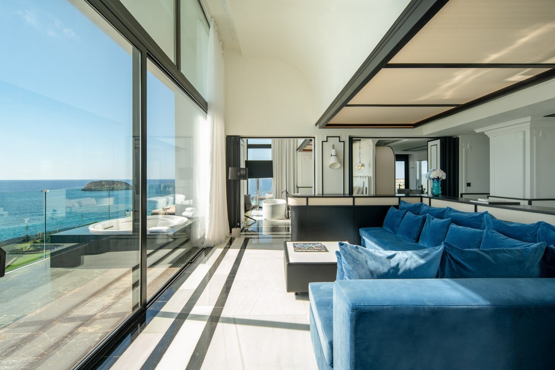 Fantastica suite di 48 m2 affacciata sul mare, vasca idromassaggio interna, soggiorno open-space e check-in VIP.