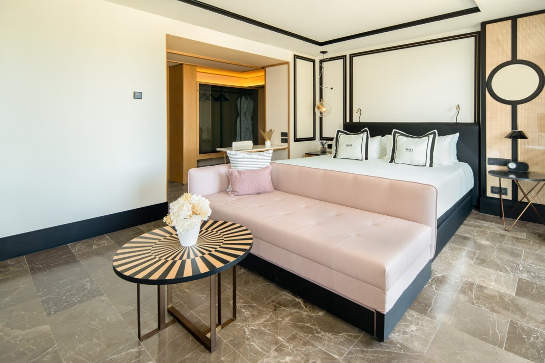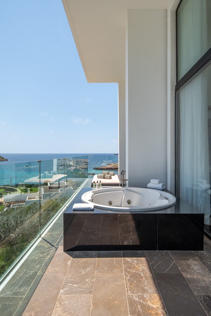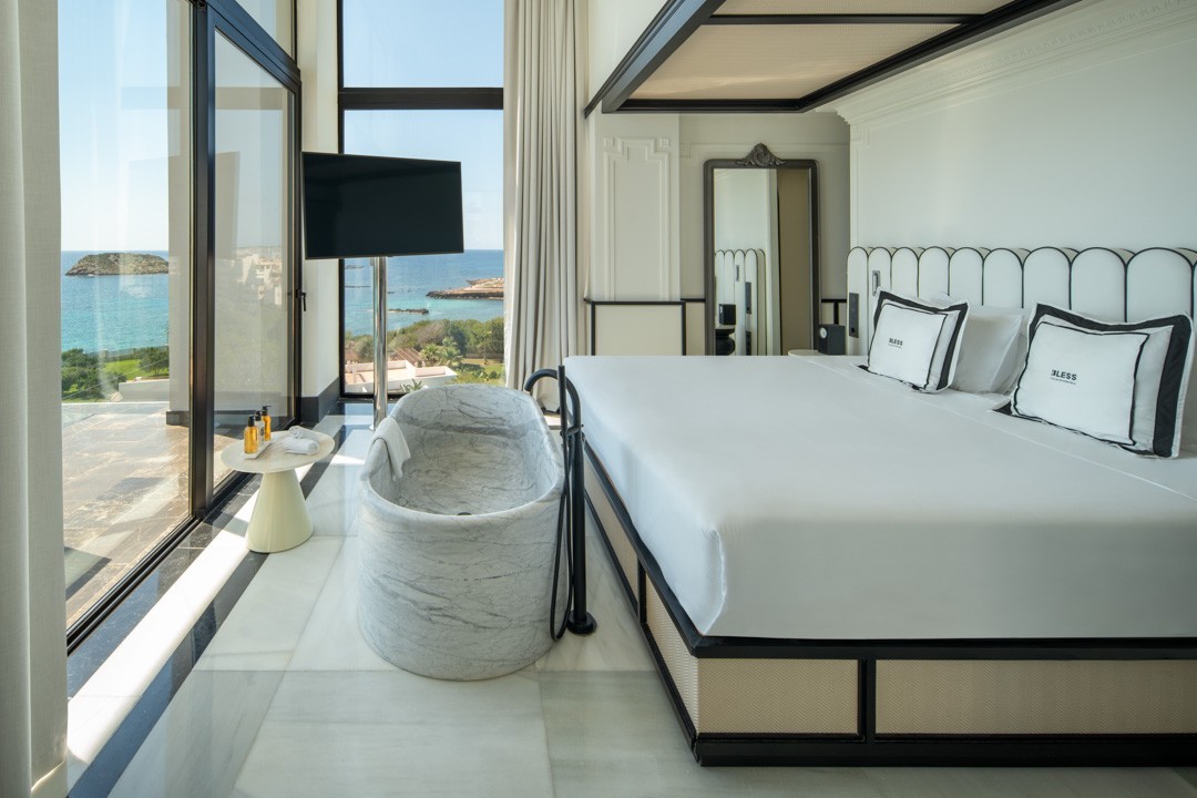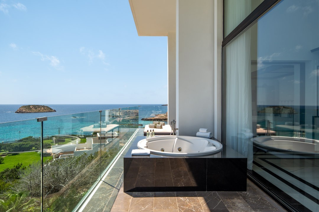 Lussuosa suite di 38 m2 con vasca idromassaggio, soggiorno open-space e scrivania. Una camera fantastica fronte mare per le tue vacanze a Ibiza.