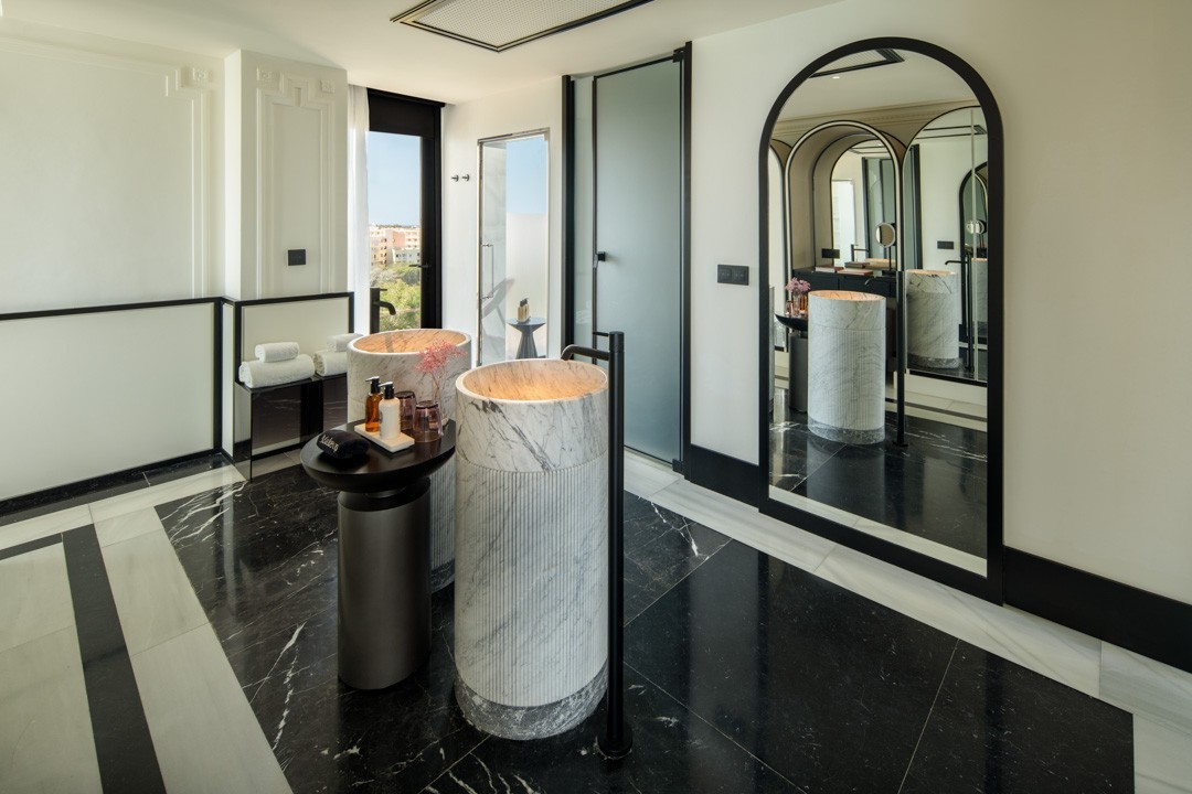 Lussuosa suite di 47 m2 con vasca idromassaggio all'aperto su un'ampia terrazza con arredi speciali e un salotto separato.