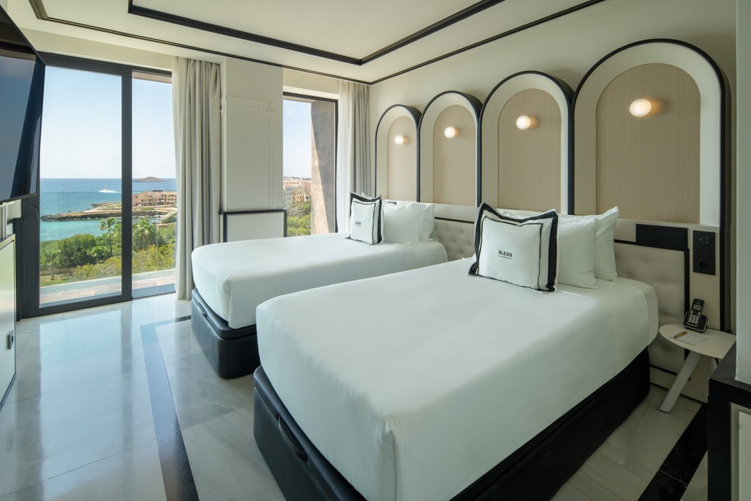 Una camera doppia di 27 m2 con comfort Deluxe, viste su Cala Nova e la costa orientale di Ibiza. Per gli epicurei che hanno voglia di mare...