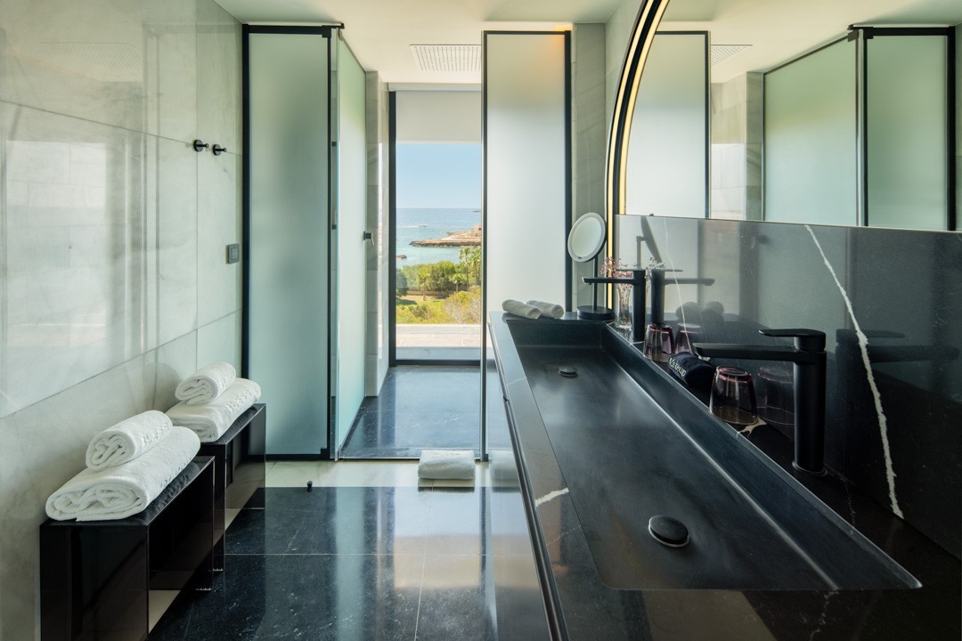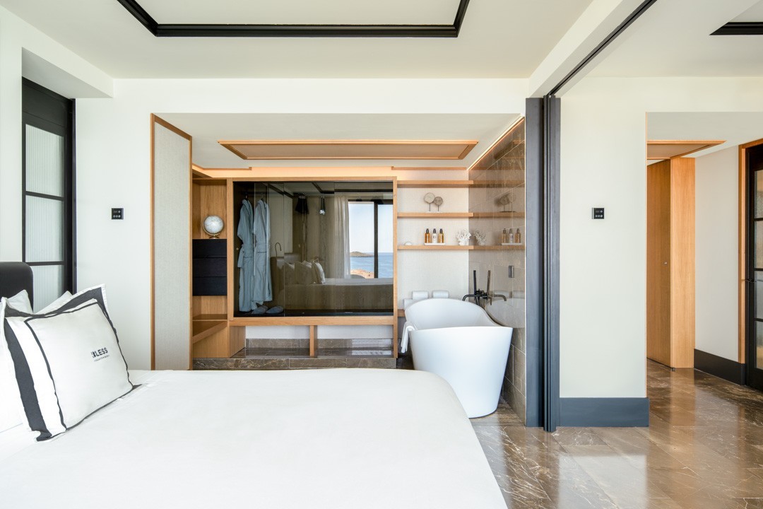 Suite esclusiva di 133 m2 con vasca idromassaggio esterna, vasca in marmo, sauna, due terrazze, due camere da letto, soggiorno, sala da pranzo, viste sul mare a 180° e letto king-size Hogo.
