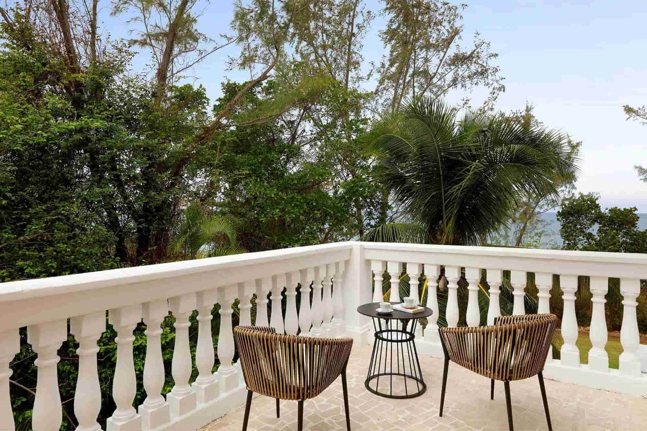 Quarto espaçoso, recém-remodelado, com um terraço moderno mobiliado com vista para a vegetação tropical exuberante.